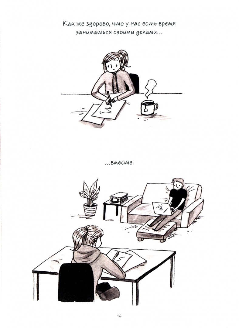 Дебби Танг делится с нами теплыми и трогательными моментами из семейной жизни. В забавных стрипах вы не раз узнаете себя и улыбнетесь глядя на героев. Они вместе занимаются спортом, готовят ужин, отмечают годовщины отношений (а порой забывают о них), едят на ночь вкусняшки, спорят по пустякам и поддерживают друг друга после тяжелого рабочего дня.