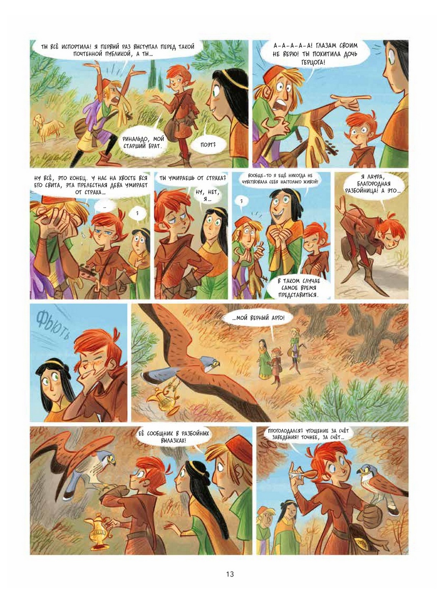Песнь первая. Лаура-разбойница: юные девы, рыцари, заговорщики и менестрели. Тоскана, 1342 год. Лючия, юная дочь герцога Фьерамоски, живет в прекрасном замке и готовится выйти замуж за богатого и знатного Кая Торнафорте. Этот брак призван скрепить политический союз двух семей, но неожиданно оказывается, что всё не так просто… Впрочем, нет худа без добра - в окрестностях замка живут Лаура и Ринальдо, брат и сестра, лишившиеся родителей и зарабатывающие себе на пропитание поэзией и грабежом. Их дружба поможет справиться с любой опасностью.